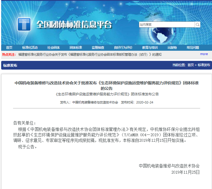 由鳳凰網(wǎng)報道,由中國機電裝備維修改造技術協(xié)會發(fā)起,聯(lián)合河北省環(huán)保治理運營行業(yè)協(xié)會、佛山市中環(huán)環(huán)保技術研究中心、中機國際工程設計研究院有限責任有限公司華東分院、廣東敏義環(huán)境科技有限公司、深圳市環(huán)境治理光電產(chǎn)業(yè)有限公司、佛山攸威光電科技有限公司、山東領先機械制造有限公司、山東濟寧精誠科技有限公司、山東棗莊遠程環(huán)保科技有限公司、石家莊科林威爾環(huán)保科技有限公司以及石家莊曼特水處理有限公司共同起草的《生態(tài)環(huán)境保護設施運營維護服務能力評價規(guī)范》團體標準,于2019年11月25日獲批發(fā)布,并于2019年12月15日正式實施。這是由協(xié)會牽頭制定的又一項關于生態(tài)環(huán)境行業(yè)方面的團體標準,不僅為提高生態(tài)環(huán)境保護設施運營維護企業(yè)的運營服務質(zhì)量控制奠定良好的基礎,更為第三方治理行業(yè)的良性健康發(fā)展保駕護航。
